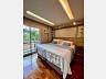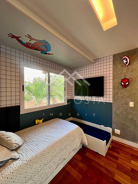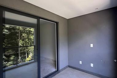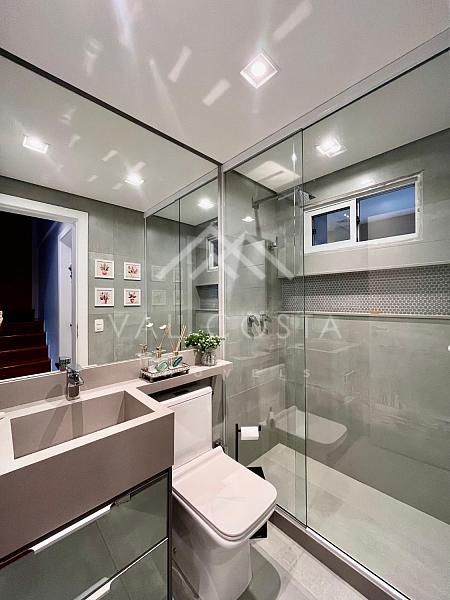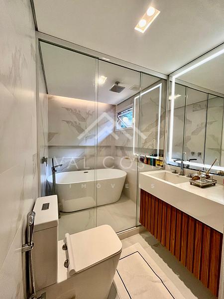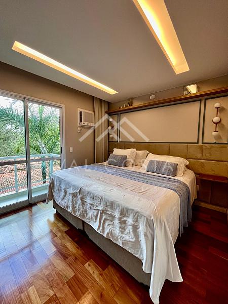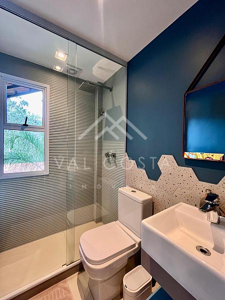 Subindo para o segundo andar, um hall distribui os acessos para as duas suítes. A suíte master impressiona com seus armários embutidos, banheiro espaçoso com banheira relaxante e uma sacada privativa que proporciona mais luz, ventilação e conexão com o ambiente natural ao redor.
