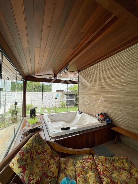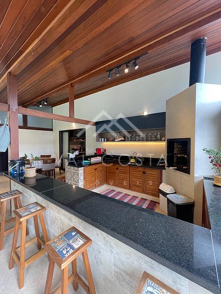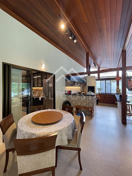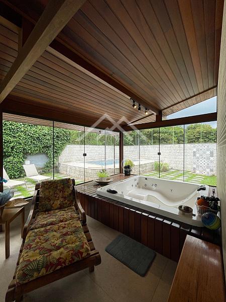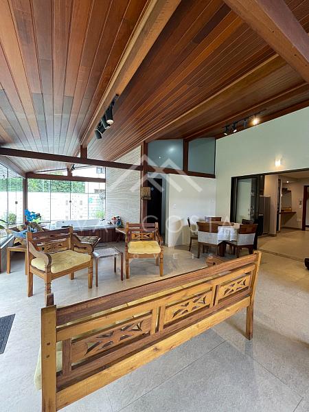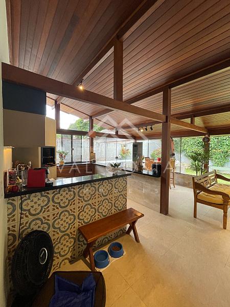 ✨ Área Gourmet e Jardim Encantador: A verdadeira joia desta casa revela-se ao acessar a área gourmet, onde uma churrasqueira, um forno de pizza e uma jacuzzi se integram perfeitamente. O revestimento em madeira de lei e blindex traz o verde exuberante do jardim para dentro do ambiente, proporcionando uma experiência única. Uma vista deslumbrante para a piscina e árvores frutíferas adicionam um toque de serenidade a este refúgio privativo.